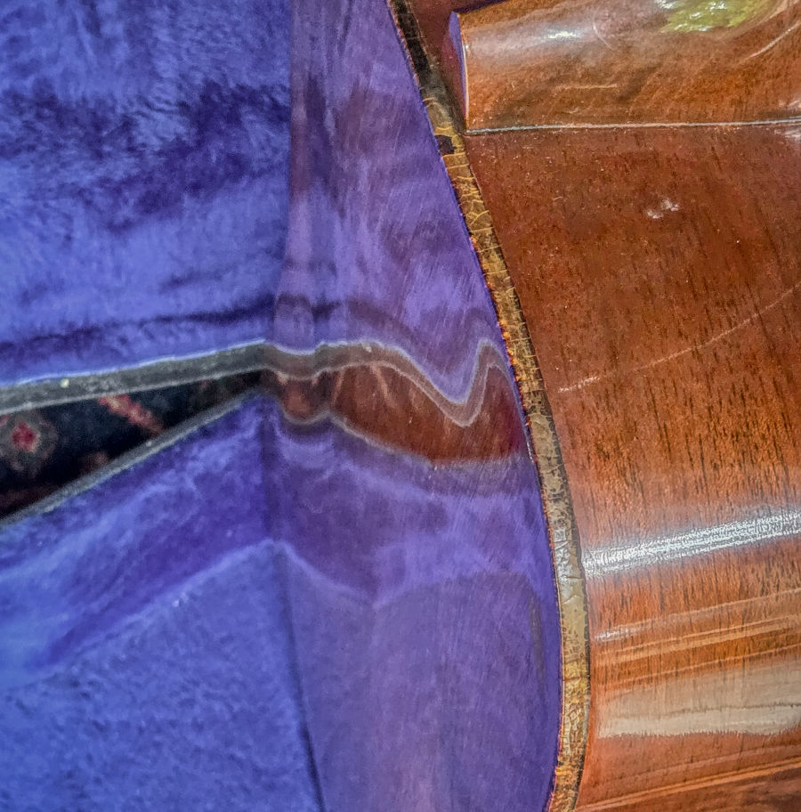 It has been recently inspected by our in-house luthier. A couple surface cracks at the upper bout were professionally cleated and repaired—normal, expected maintenance for an instrument of this age. The truss rod was checked and required no adjustment.